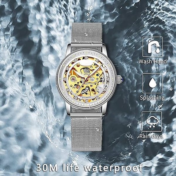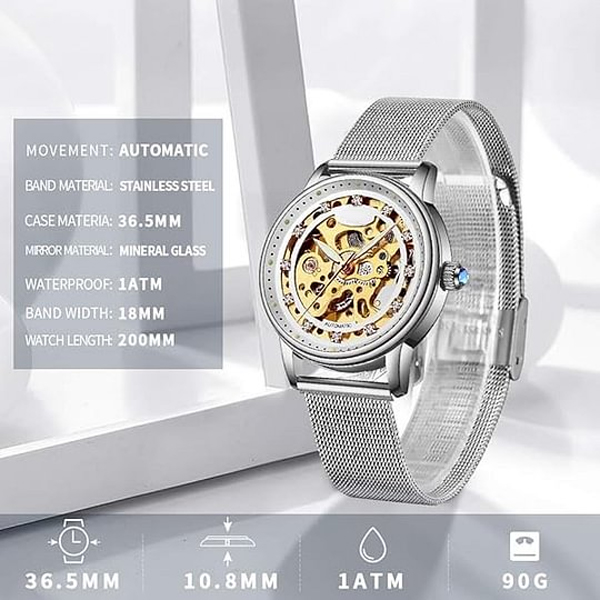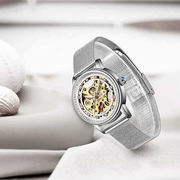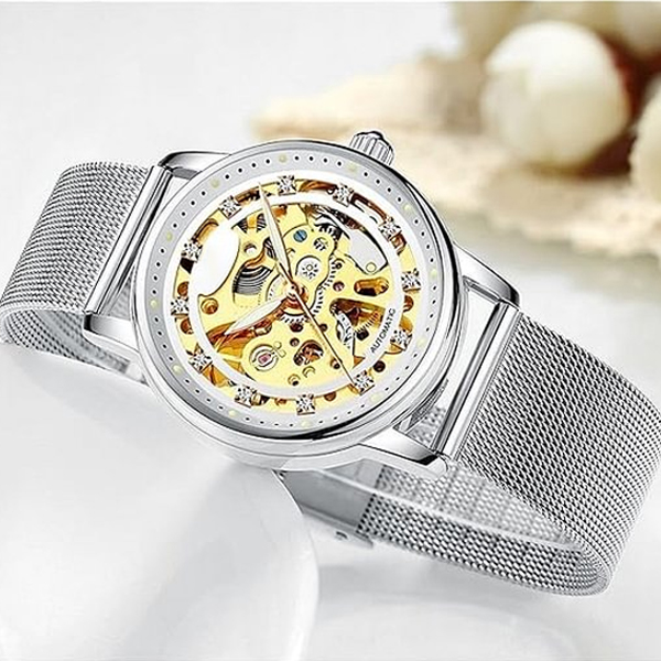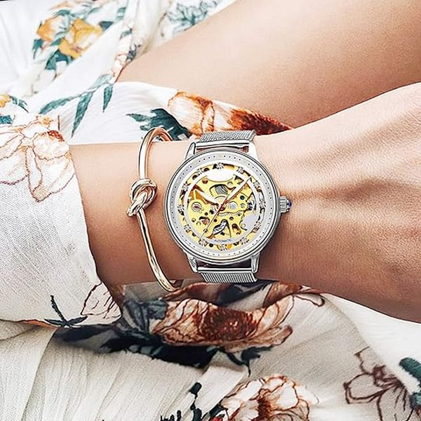 • Women's Watch Luxury Mechanical Stainless Steel Skeleton Steampunk Automatic Self Winding Wristwatch Silver