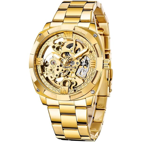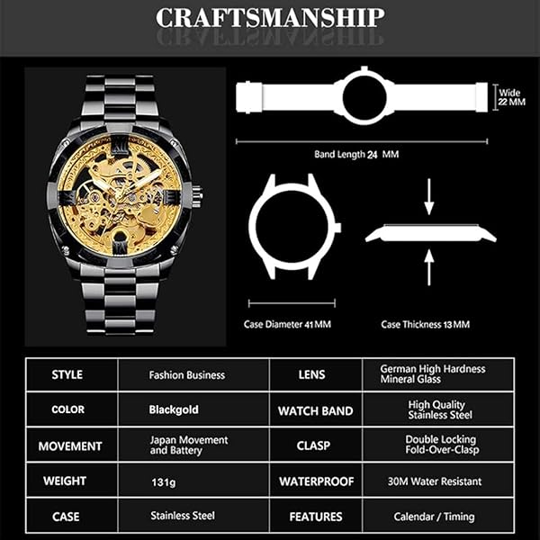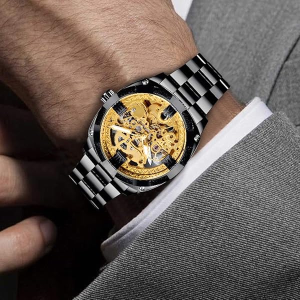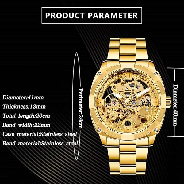 • Mechanical Men's Watch Stainless Steel Automatic Skeleton Watch Waterproof Watches for Men Father’s Day Gift Gold
