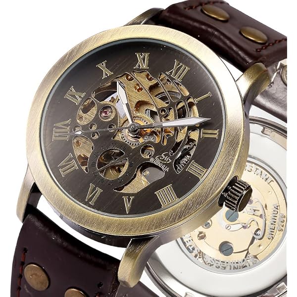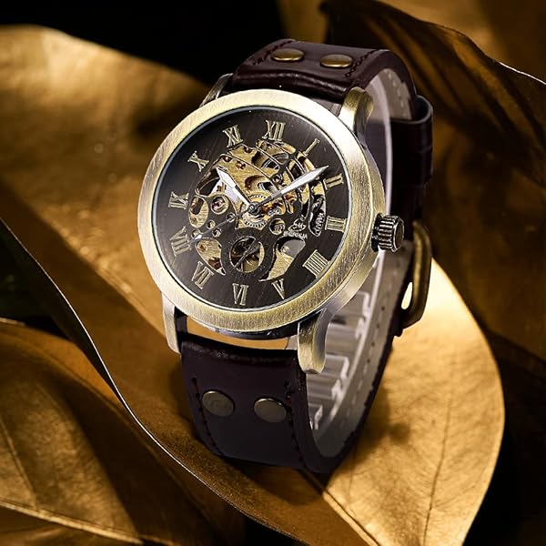 • Men's Steampunk Bronze Skeleton Self-Winding Automatic Mechanical Brown Leather Wrist Watch (10 PCS)